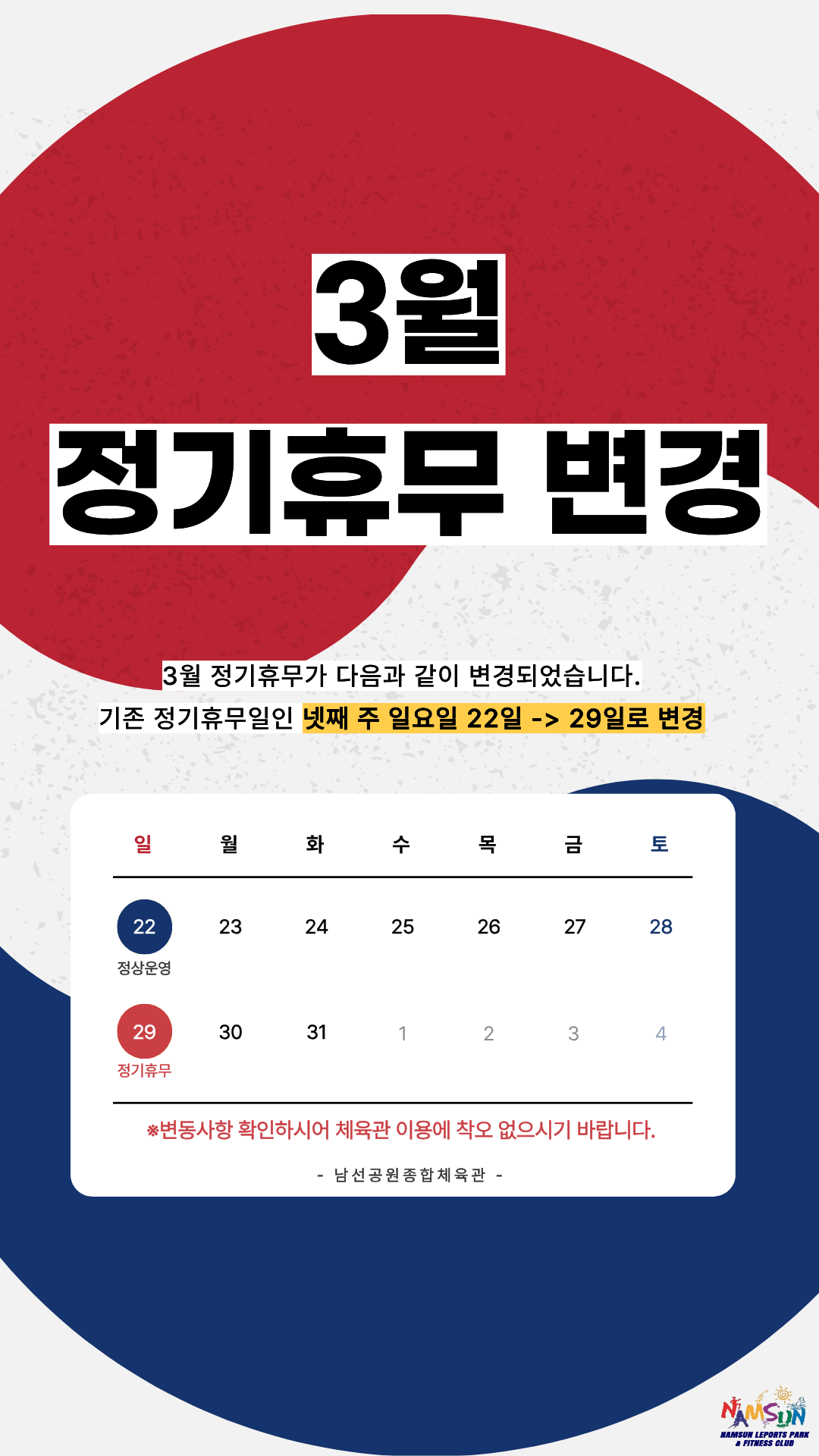 남선공원종합체육관은 사계절 내내 다양한 체육시설을 이용할 수 있는 실내 종합체육관입니다. 추운 날씨에도 걱정없이 쾌적한 실내 공간에서 운동과 여가를 편안히 즐기실 수 있습니다. 계절이 바뀌어도, 건강한 하루는 계속됩니다!